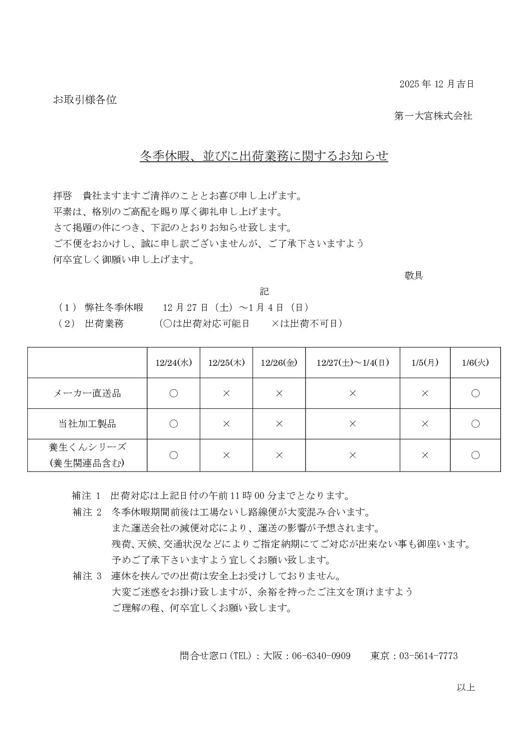 冬期休暇:12月27日(土)~1月4日(日) 年内最終出荷は、12月24日(遠方は除く)となりますが 運送便の混雑が予想されますので、お早めにご注文をお願いします。 年明けの出荷は、1月6日からとなります。